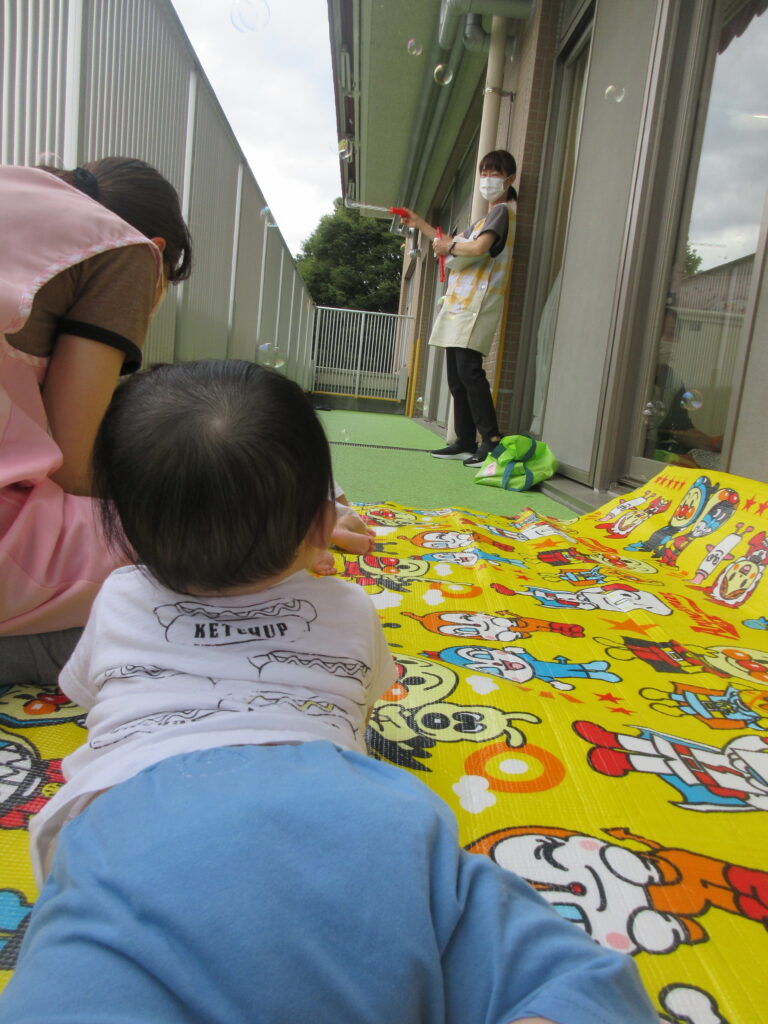 暑かった夏も終わり、ようやく涼しくなってきました。心地よい気候になると、お外に出て遊べる日も増えてきます。今日うさぎ室では、みんなでベランダに出て、しゃぼん玉をしました。飛んでいくしゃぼん玉を、じっと目で追ったり手を伸ば…