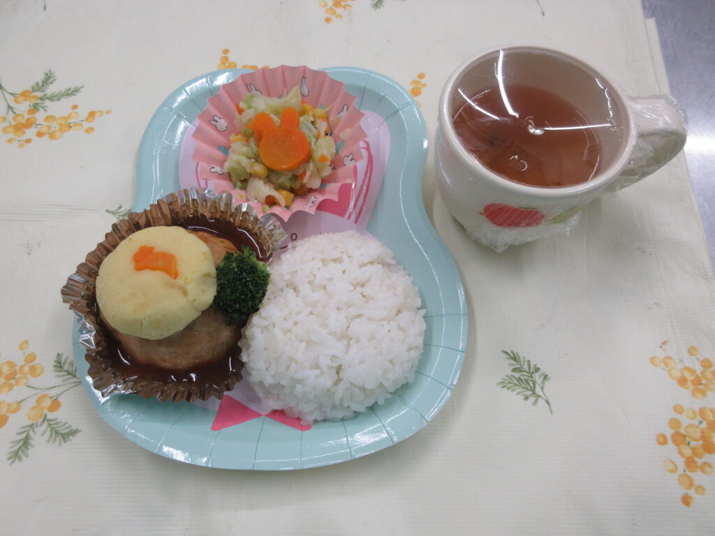 10月6日は中秋の名月でした。 厨房さんがお昼ご飯に【お月見ハンバーグ】、おやつに【お月見三色ゼリー】をつくってくれました。 ハンバーグにもサラダにもゼリーにもかわいいうさぎが乗っています。 みんな「かわいー」と言いなが…