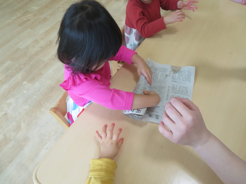 大きい子どもたちは職員の見本を見て上手に包むことができました。小さい子どもたちも大きい子の真似をして一生懸命包んでいました。