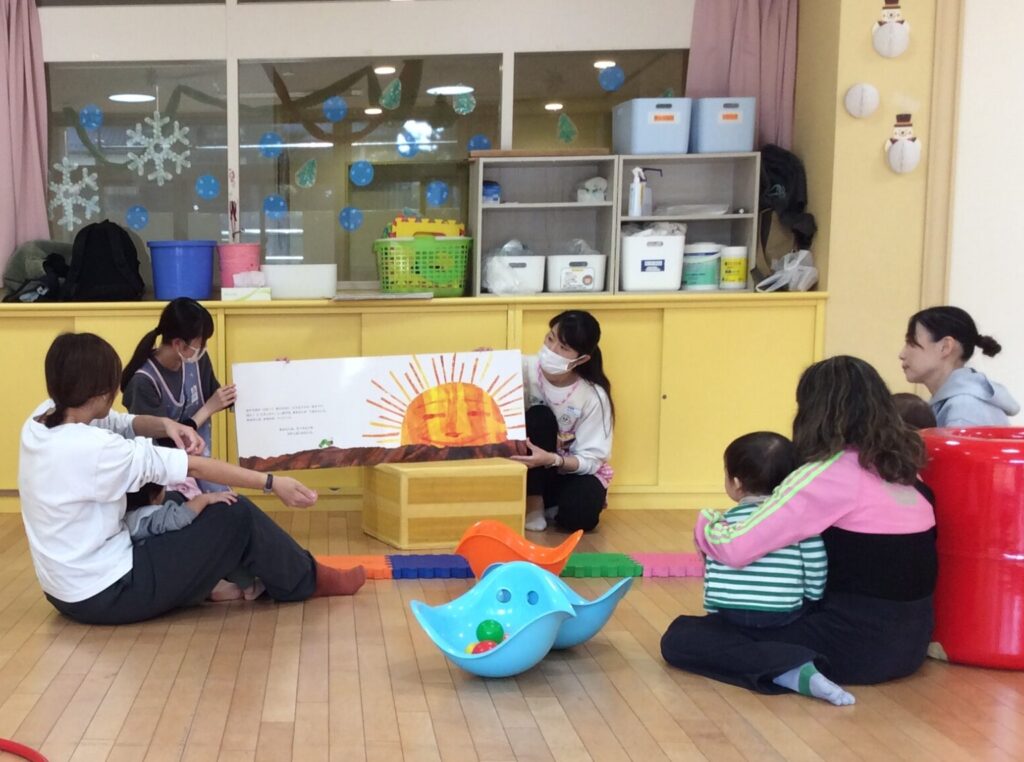 11月は「大型絵本を楽しもう」というイベントをしました。読み聞かせをすると、みんな真剣な表情でお話を聞いていました。読み聞かせの後は大型絵本をめくったり、大きな絵や色を観察したりと、それぞれの楽しみ方をしていました。