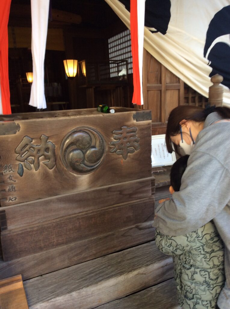 神社では、鈴を鳴らしお賽銭を入れてお参りしました。