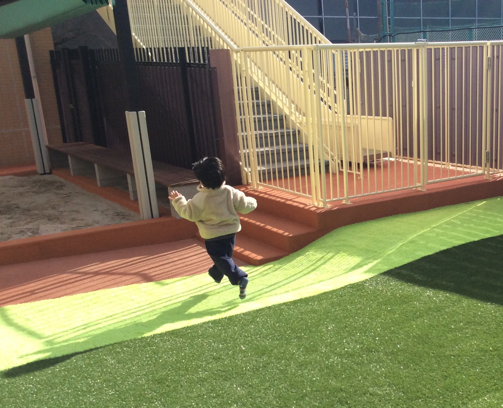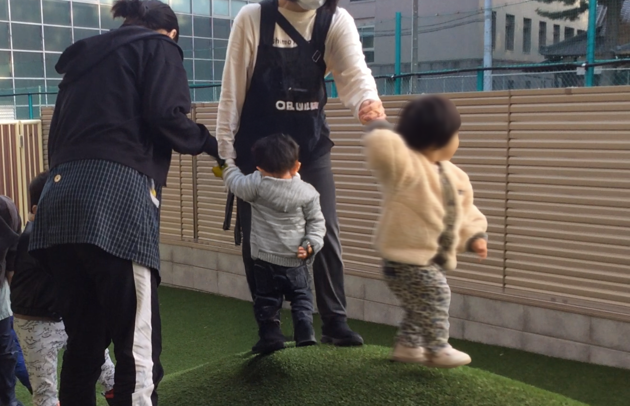 築山に走って登る子がいたり、養育者と手をつないで登る子がいたり。