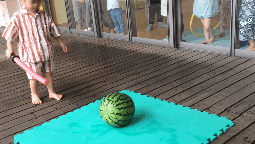 とても暑い夏の日、みんなですいか割りをしました。 お友達が見守ってくれているなか、ひとりずつ順番にすいかをたたきました。すいかが割れることはなかったけど、厨房さんが切ってくれて、午後のおやつにみんなで食べました。 とって…